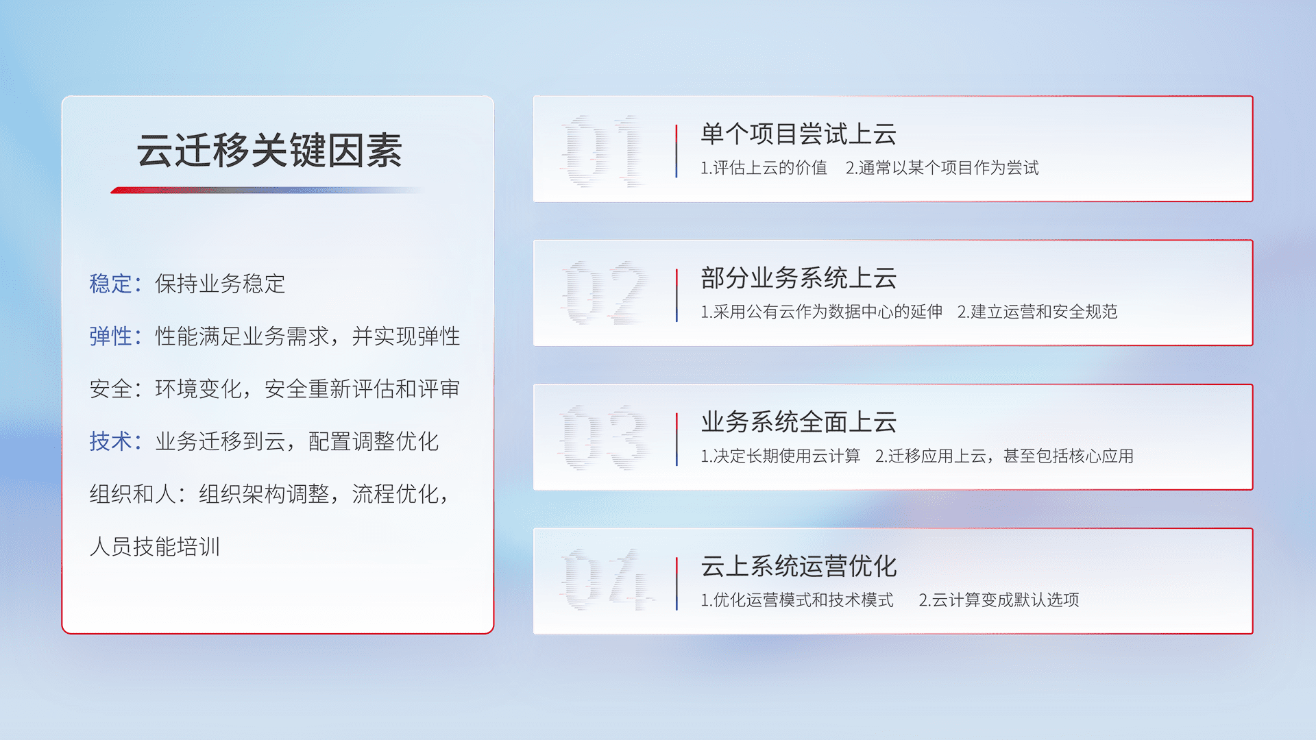 结合实际业务,,,从规划设计、、、云平台选型、、云原生改造、、、、数据迁移、、集成交付,,迁移全过程为客户识别最佳上云路径,,,做好风险识别管理,,,设计网络架构、、、、身份权限、、安全审计合规、、、操作审计、、、、日志审计、、监控告警策略、、多站点容灾设计等,,,对云上基础设施进行整体规划,,,提升IT治理水平,,,以满足弹性、、高可用、、高性能的需求。。。。