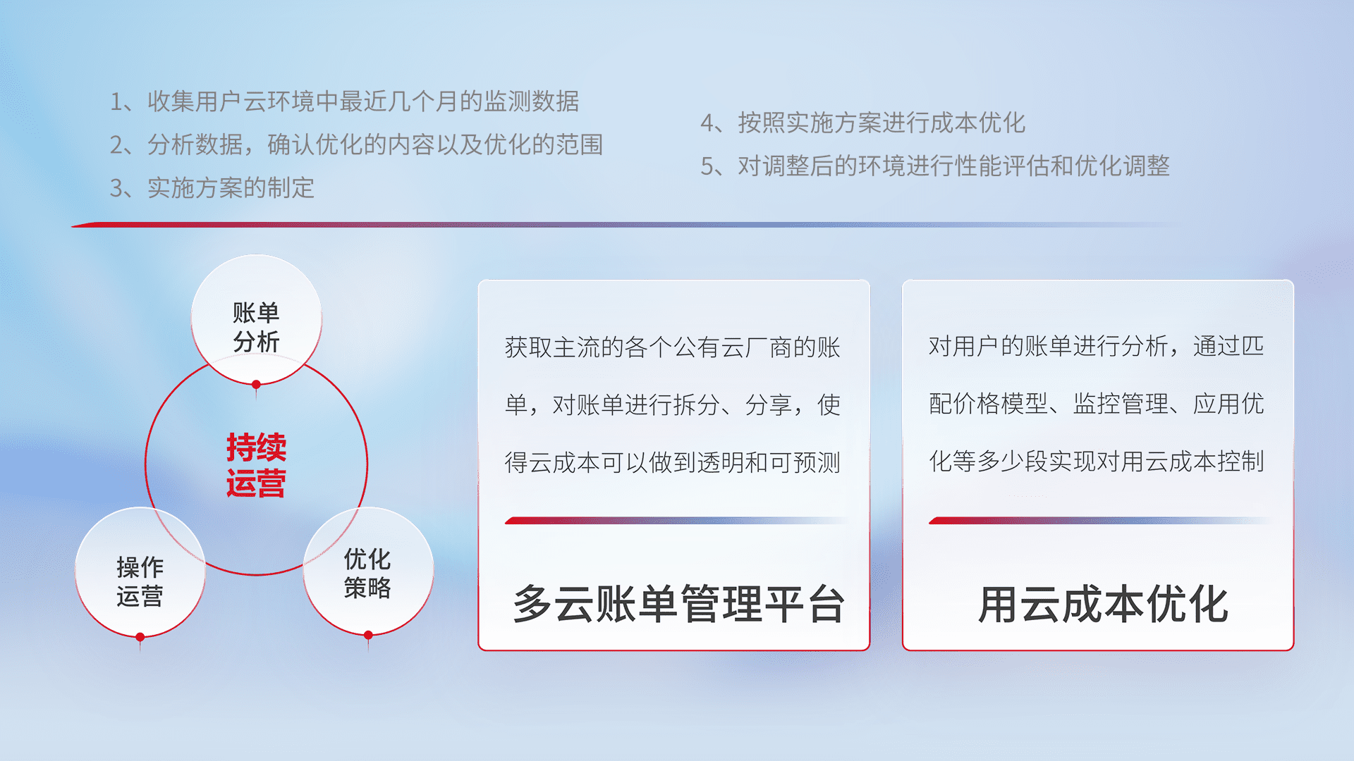 通过多云纳管,,,,以统一的资源数据模型把客户的云资源进行抽象和封装,,,,进而实现对多云资源的统一操作,,,,保障云资源管理的可靠性、、、、稳定性与可用性。。。量身定制化运维内容,,配置、、开发运维、、、补丁管理、、、备份、、、监控、、、认证和访问管理、、、审计和日常巡检等,,,,保障在用云过程中的可靠度,,,,稳定度以及高可用率。。。