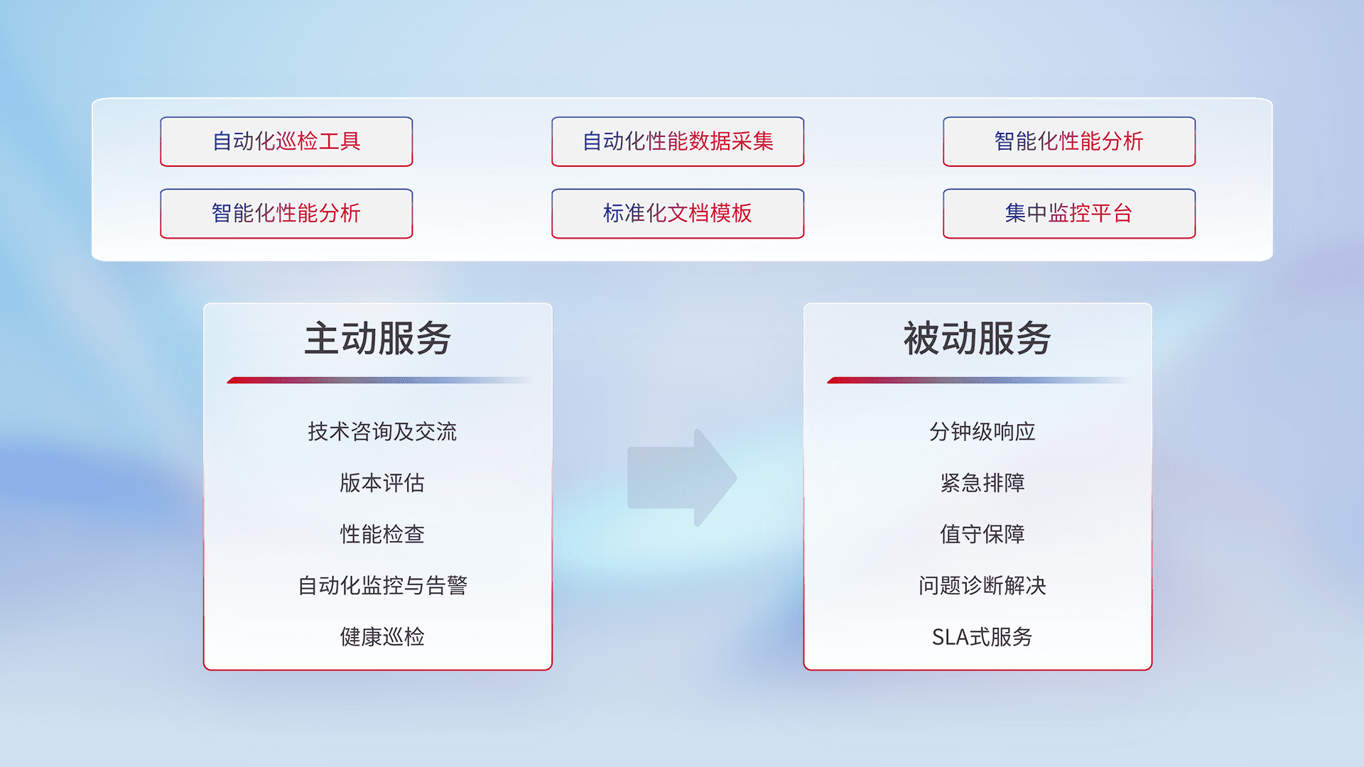 智能化工具和标准化文档,,,,保障服务质量,,,提供主动服务(包含技术咨询、、、、版本评估、、性能检查、、、自动化监控与告警、、、健康巡检)和被动服务包含(分钟级响应、、、、紧急排障、、值守保障、、、问题诊断解决、、、SLA服务)。。。